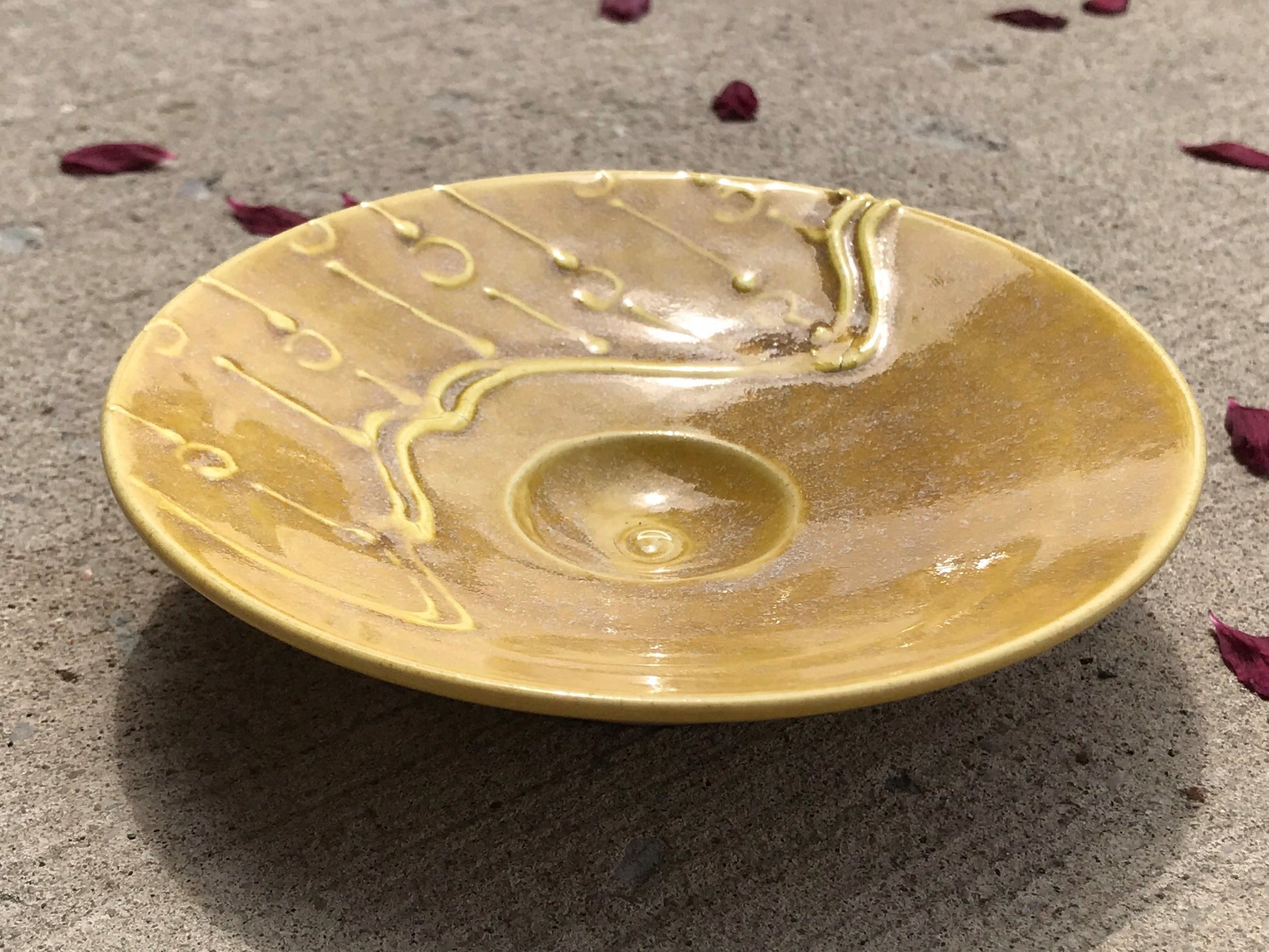 HOW TO USE THE PEN - Before using the pen on your ceramic piece, first shake it vigorously and then test the flow by squeezing some of the slip out on a piece of paper. This should remove any air bubbles and establish a consistent flow of slip. If the slip has become too thick to flow properly, unscrew the black plastic cap and pour 2 or 3 drops of water into the bottle. Then replace the cap, shake and test again. When you are using the pen on a piece of greenware or bisque, hold the pen tip in contact with the piece. It makes it easier to control the writing than if you hold the tip above the piece and drop the color onto the surface. Also the slight scratching of the surface improves the bonding between the slip and the piece. Do not hold the pen directly vertical while writing because this leaves no gap for the liquid to flow out of. Instead hold the pen at an angle to the surface so that there is an opening for the slip to flow through. Because the slip is quite thick you need to write more slowly than with a pen. This allows time for the liquid to flow through the tip. You can create a large variety of line thicknesses by varying finger pressure and writing speed. The harder you press and the slower you write the thicker your lines will be.