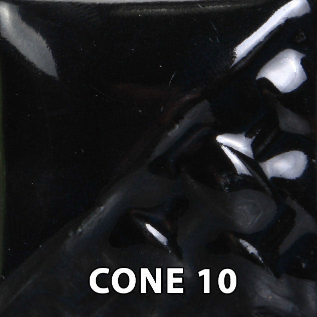 Cone 6: Black Gloss is a highly-pigmented true black gloss glaze. The stable qualities of this glaze make it ideal for design work and full opaque coverage at mid-range temperatures. Glaze turns to satin gloss at cone 5 and high gloss at cone 6.