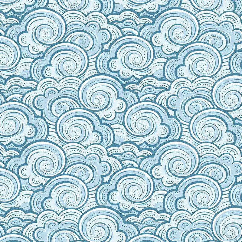 A multicolored pattern of overlapping clouds in a swirly, whimsical style. Colors featured include different shades of blue.