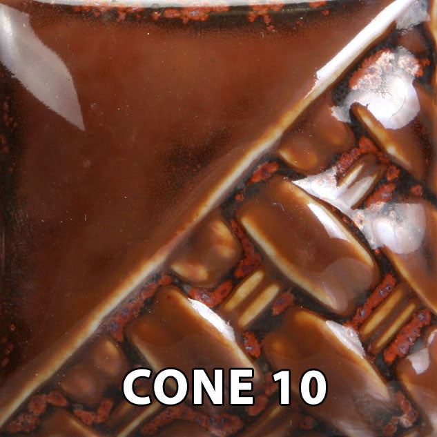 Cone 6: Copper Float glaze is a rich and complex midrange glaze with hues varying from reds, to coppers to gun metal blacks. Predominate coloration is a dark rusty red. The surface is satin-matte when fired to cone 5 or 6. Cone 10: Finish flattens. Color changes to a warm brown with some copper mottling. TIP: One coat will produce dark, greenish tones, thicker coats will add greens. Thickest applications will result in metallic red hues.