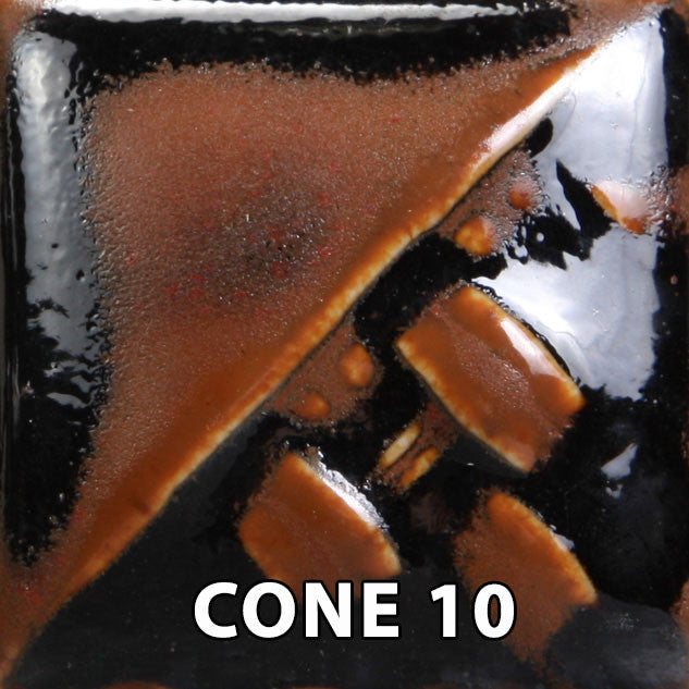 Cone 6: Copper Ore is a highly mobile, reddish brown metallic glaze. A dark bronze field breaks with areas of darker coloring and flashes of brighter red metallic. The movement within this glaze produces striking visual textures. Cone 10: Finish flattens. Color turns to red/brown. Increased movement. TIP: This glaze WILL move. Take care when using on vertical pieces – reduce glaze thickness towards the bottom third to minimize run-off.