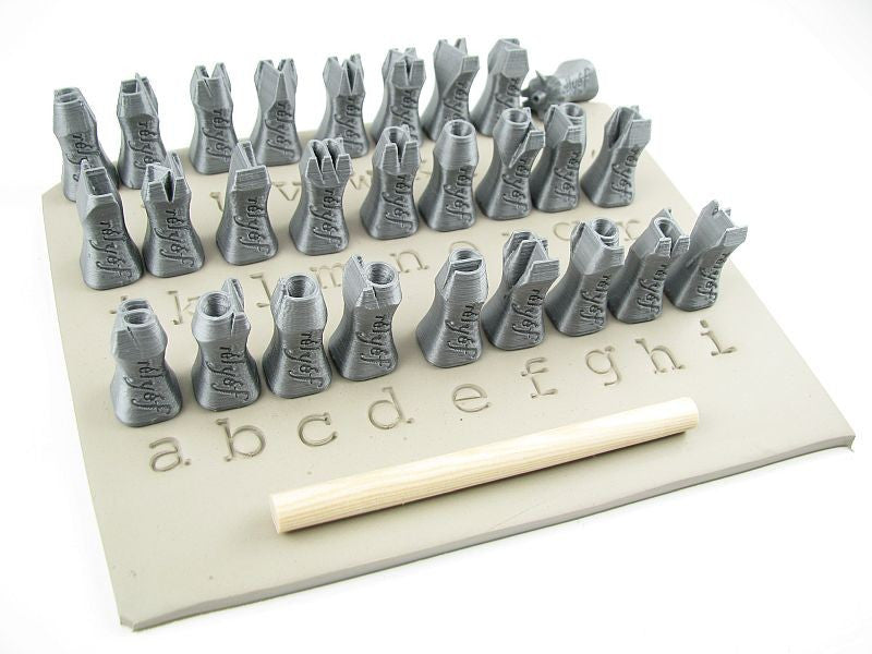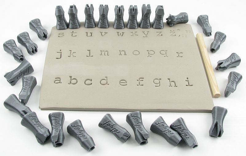 Set contains 27 stamps of Courier alphabet font lower case (height 10 mm), one combined stamp punctuation / diacritic, a wooden rod (8 mm in diameter) and instructions.
