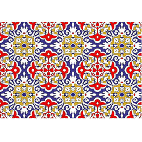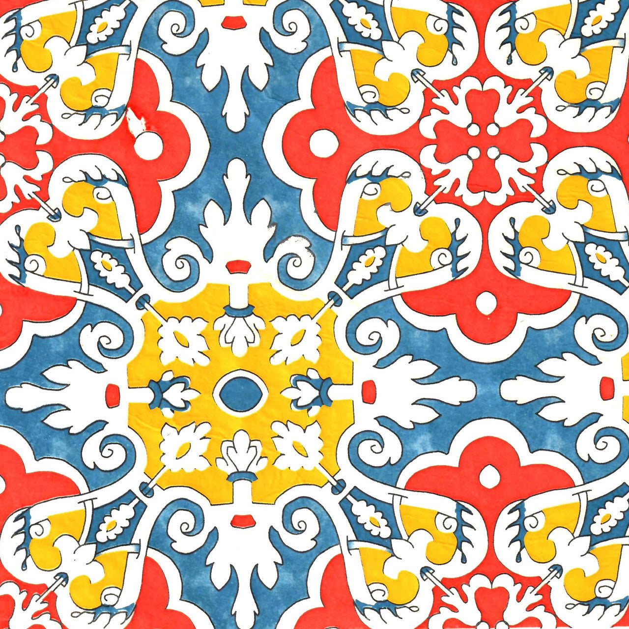 A multicolored, abstract pattern of swirling shapes. Colors featured include yellow, blue, and red.
