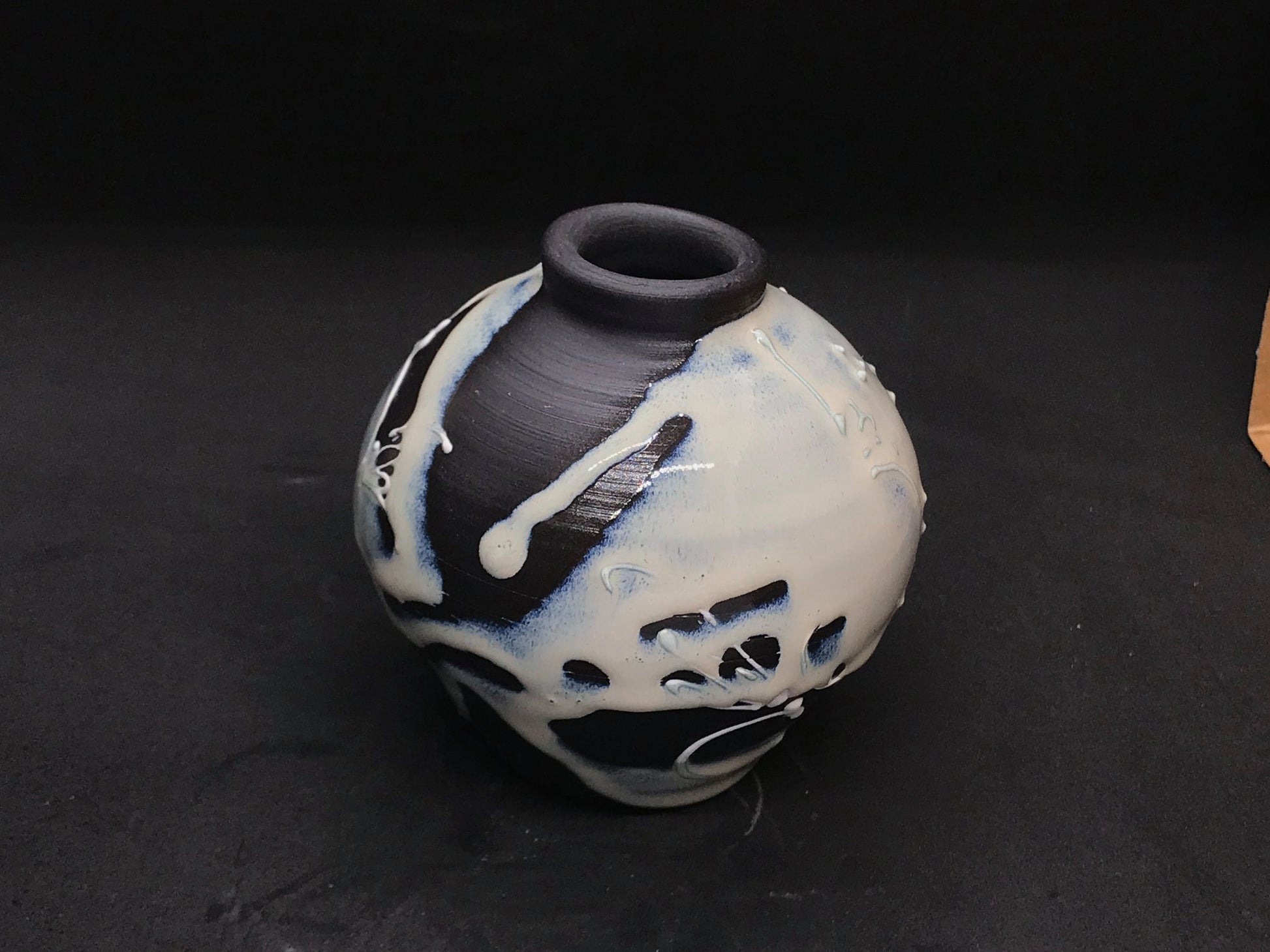 HOW TO USE THE PEN - Before using the pen on your ceramic piece, first shake it vigorously and then test the flow by squeezing some of the slip out on a piece of paper. This should remove any air bubbles and establish a consistent flow of slip. If the slip has become too thick to flow properly, unscrew the black plastic cap and pour 2 or 3 drops of water into the bottle. Then replace the cap, shake and test again. When you are using the pen on a piece of greenware or bisque, hold the pen tip in contact with the piece. It makes it easier to control the writing than if you hold the tip above the piece and drop the color onto the surface. Also the slight scratching of the surface improves the bonding between the slip and the piece. Do not hold the pen directly vertical while writing because this leaves no gap for the liquid to flow out of. Instead hold the pen at an angle to the surface so that there is an opening for the slip to flow through. Because the slip is quite thick you need to write more slowly than with a pen. This allows time for the liquid to flow through the tip. You can create a large variety of line thicknesses by varying finger pressure and writing speed. The harder you press and the slower you write the thicker your lines will be.