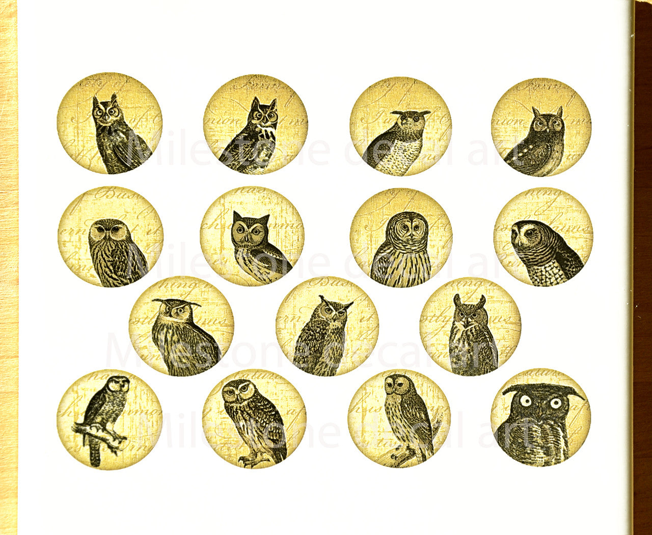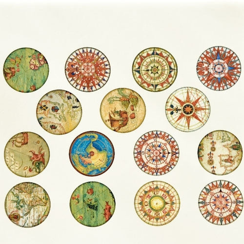 Individual full color circles depicting different images. Versions available include antique map, diatoms, kimono, and owls. Colors included are orange, brown, blue, green, red, and black.