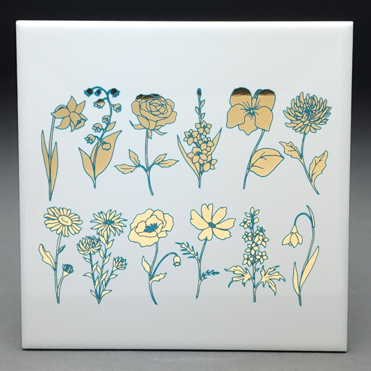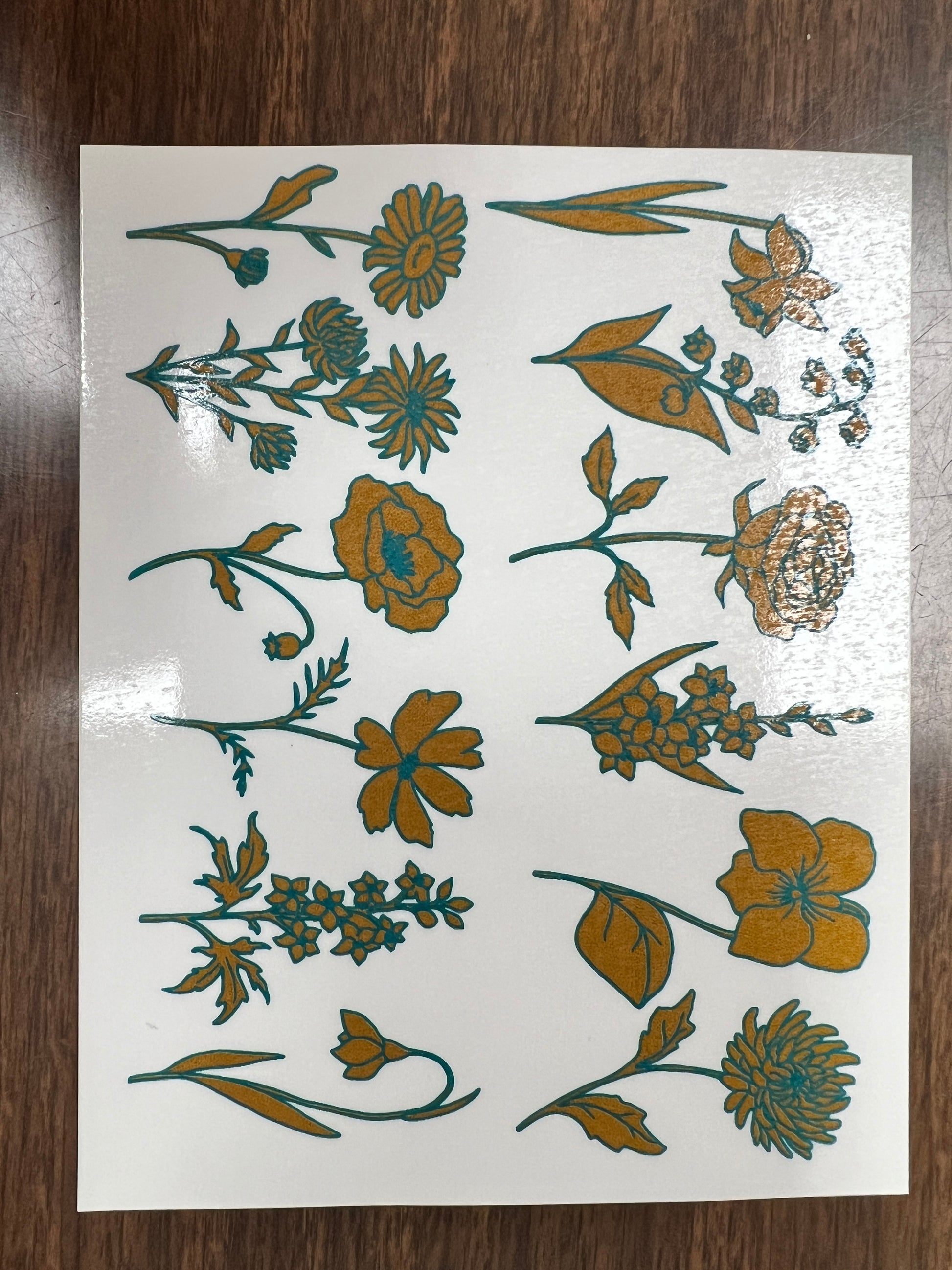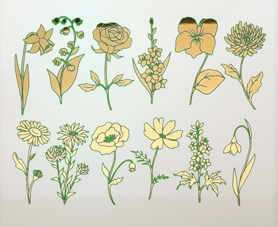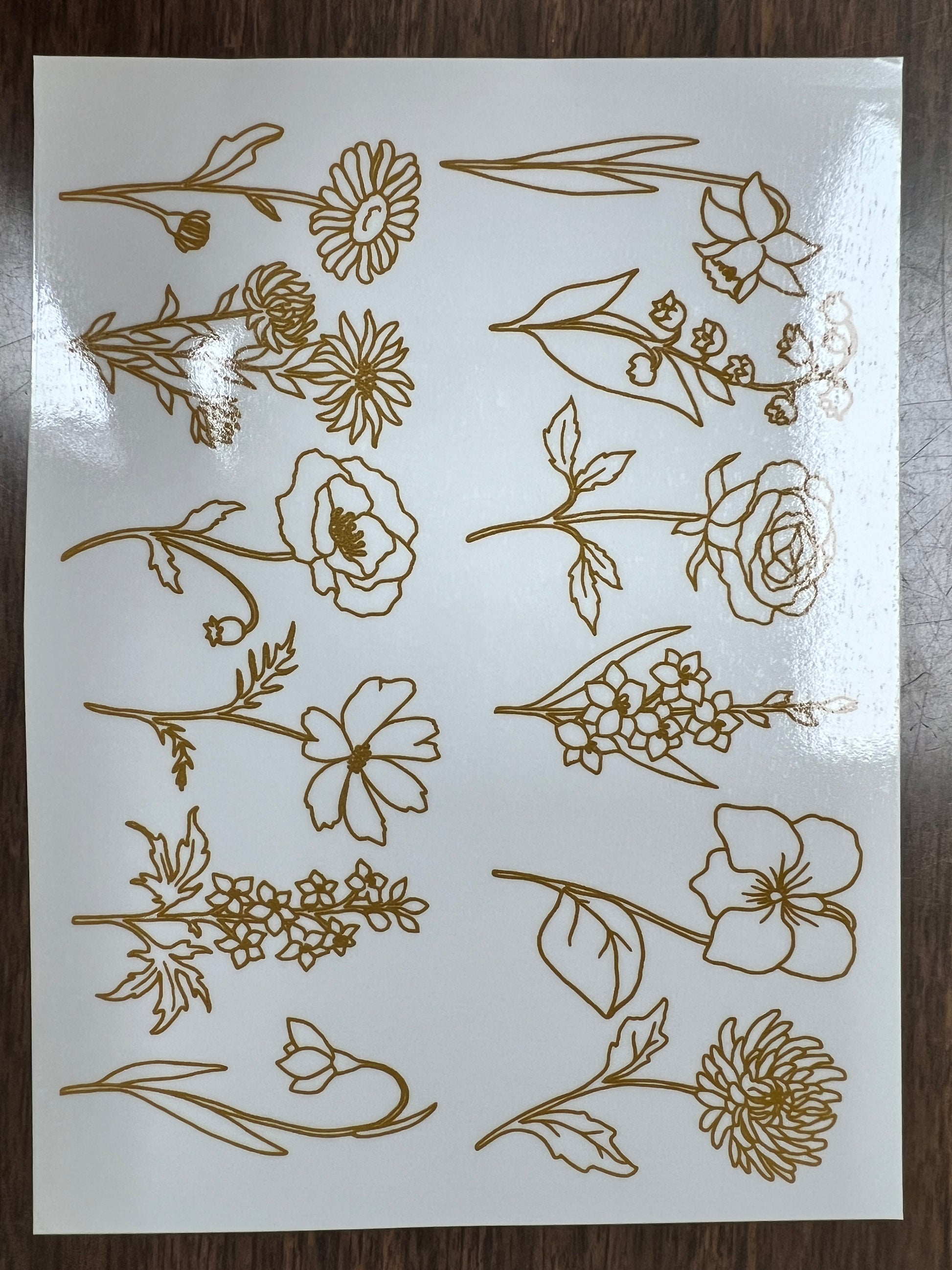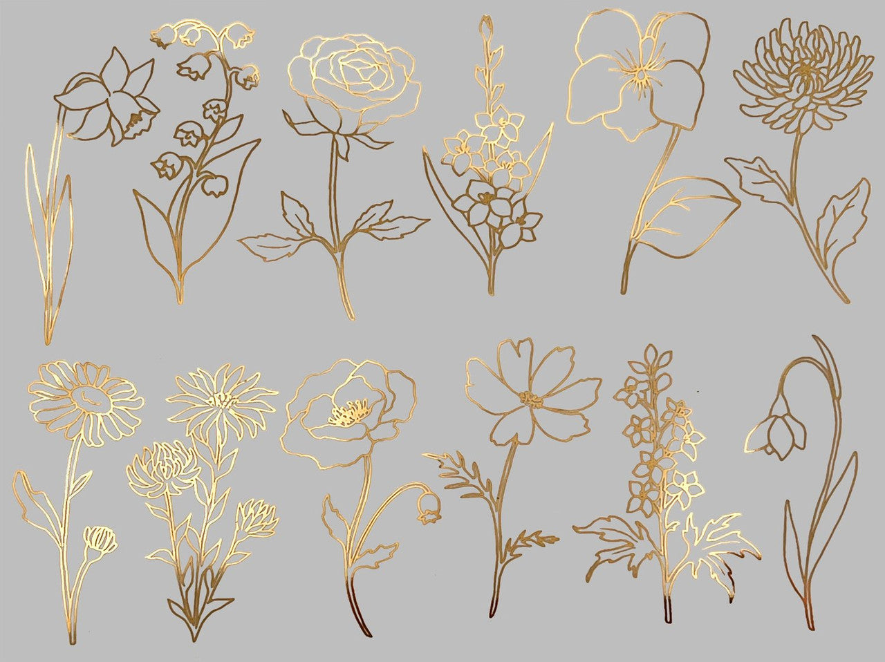 Individual flowers in different kinds and positions. Available in gold, silver, copper, turquoise & gold, green & gold, black, blue, and white.