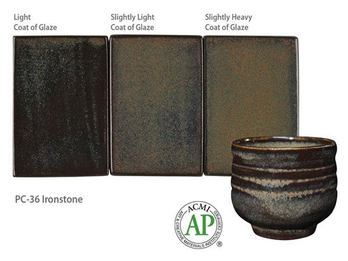 Ironstone is a glossy, dark glaze that is a deep chocolatey brown where thin with a beige-bronze float where thicker. Mixes well with other Potter's Choice glazes.