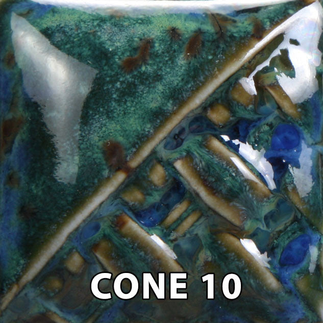 Jungle Gems™ Crystal Glazes have been formulated to mature at cone 06/05. However can be fired at higher temperatures. Their performance at cone 6 is noted on each individual product label. Crystals tend to flow at higher temperatures so take care on vertical pieces. We recommend testing on your clay body and in your kiln prior to use.
