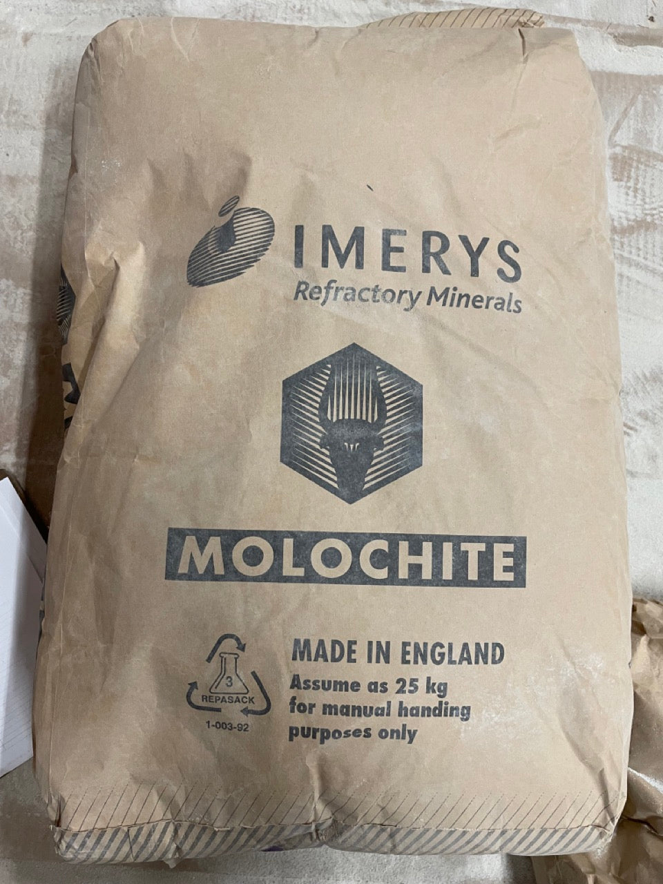 Molochite is very white material that is typically used in porcelains as a grog and aggregate. Molochite has a low thermal expansion, is resistant to thermal shock, and has a high mechanical stability, making it useful to add to some clay bodies. 120 mesh is a medium sized grain.