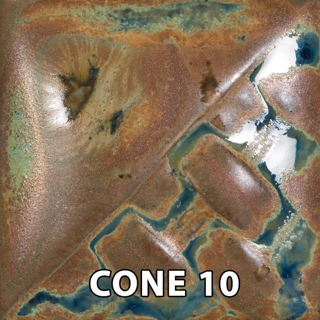 Cone 10: Glossy blue becomes more prominent. Increased movement. TIP: SW-174 Leather is the base glaze. For a lighter crystal effect, you may try applying two coats of SW-174 Leather with a third coat of SW-179 Muddy Waters.