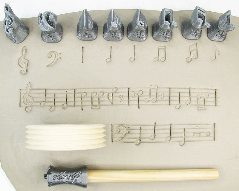 Set contains 9 stamps of musical symbols, roller with pattern of staff, a wooden rod (8 mm in diameter) and instructions.