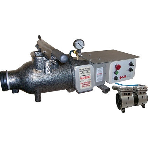 Vacuum is provided by a 1/2 HP double-headed rocking piston type diaphragm pump. These new technology pumps are the simplest and quietest vacuum source available. They are maintenance-free and long lasting. The VPM-9 Power Wedger does not require a large vacuum pump because the clay is continuously exposed to vacuum in the sealed mixing chamber. Once the clay chamber is evacuated, the vacuum pump can be turned off.