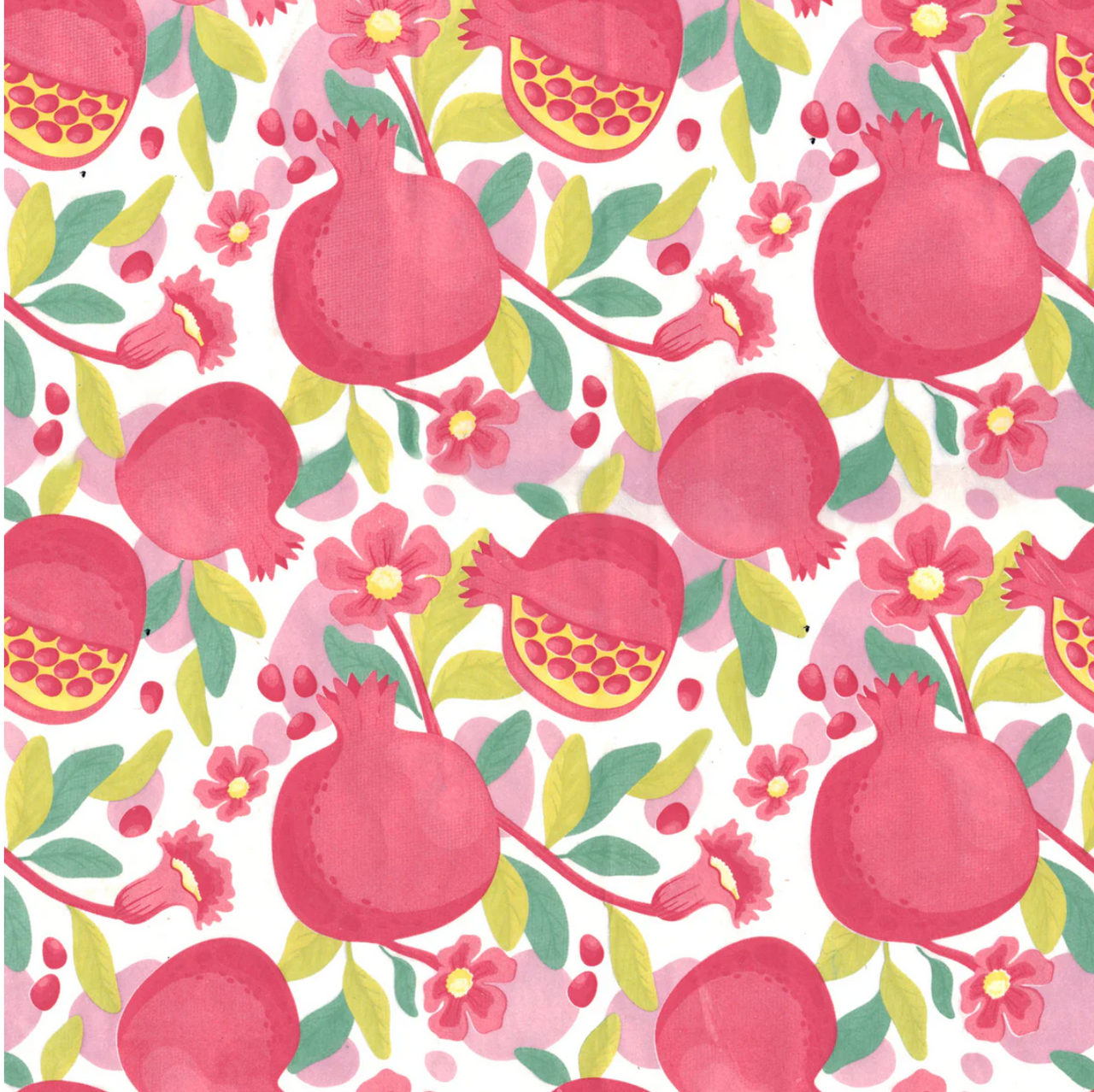 A multicolored pattern of overlapping pomegranates, their leaves and flowers, some pomegranates whole and some cut. Colors featured include red, pink, yellow, and green.