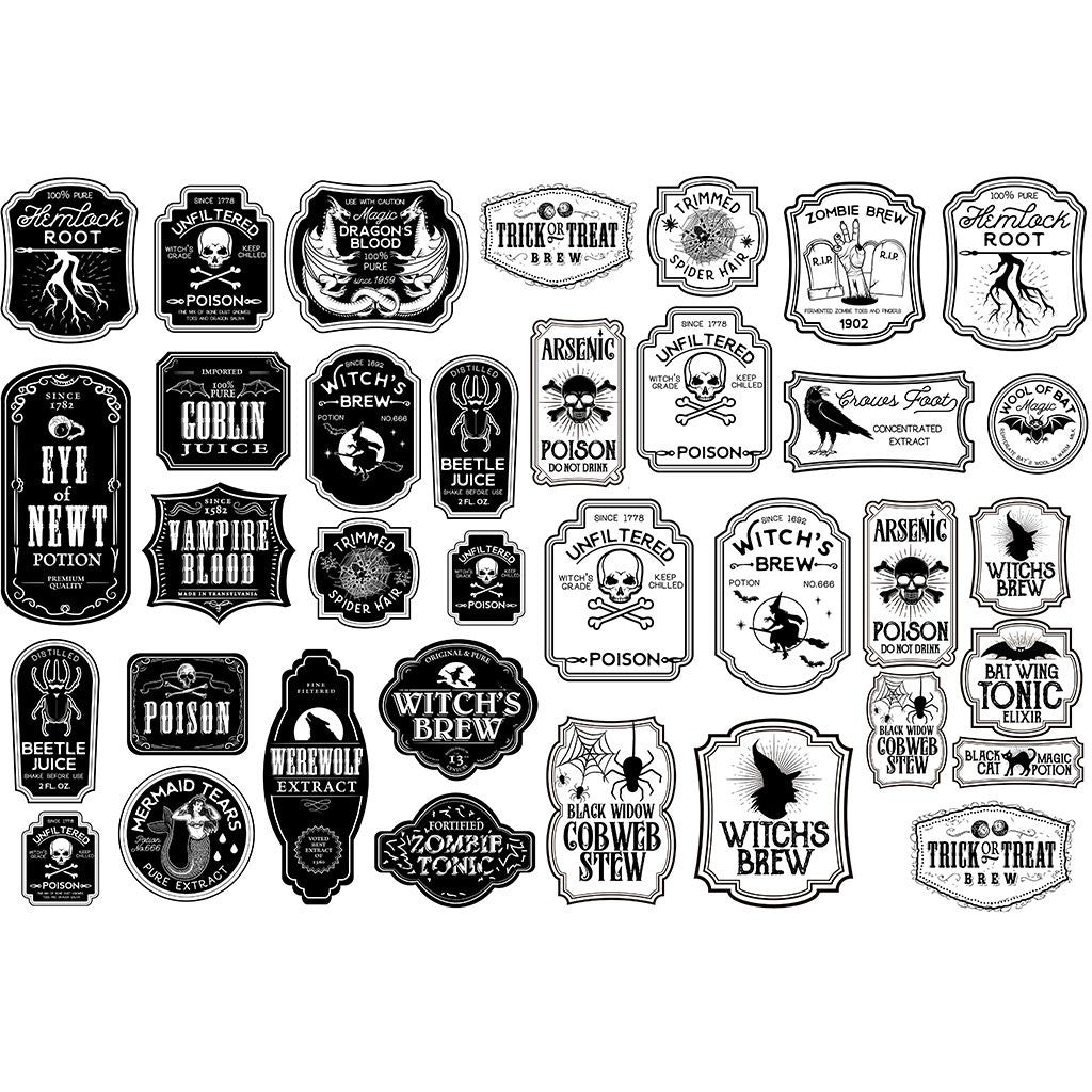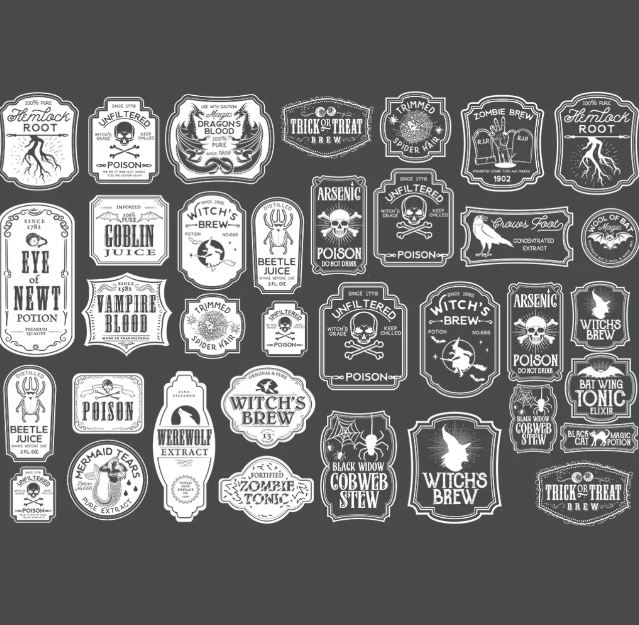 Individual, Halloween themed potion labels including Witches' Brew, Trick or Treat Brew, Dragons's Blood, and more. Available in black and white.
