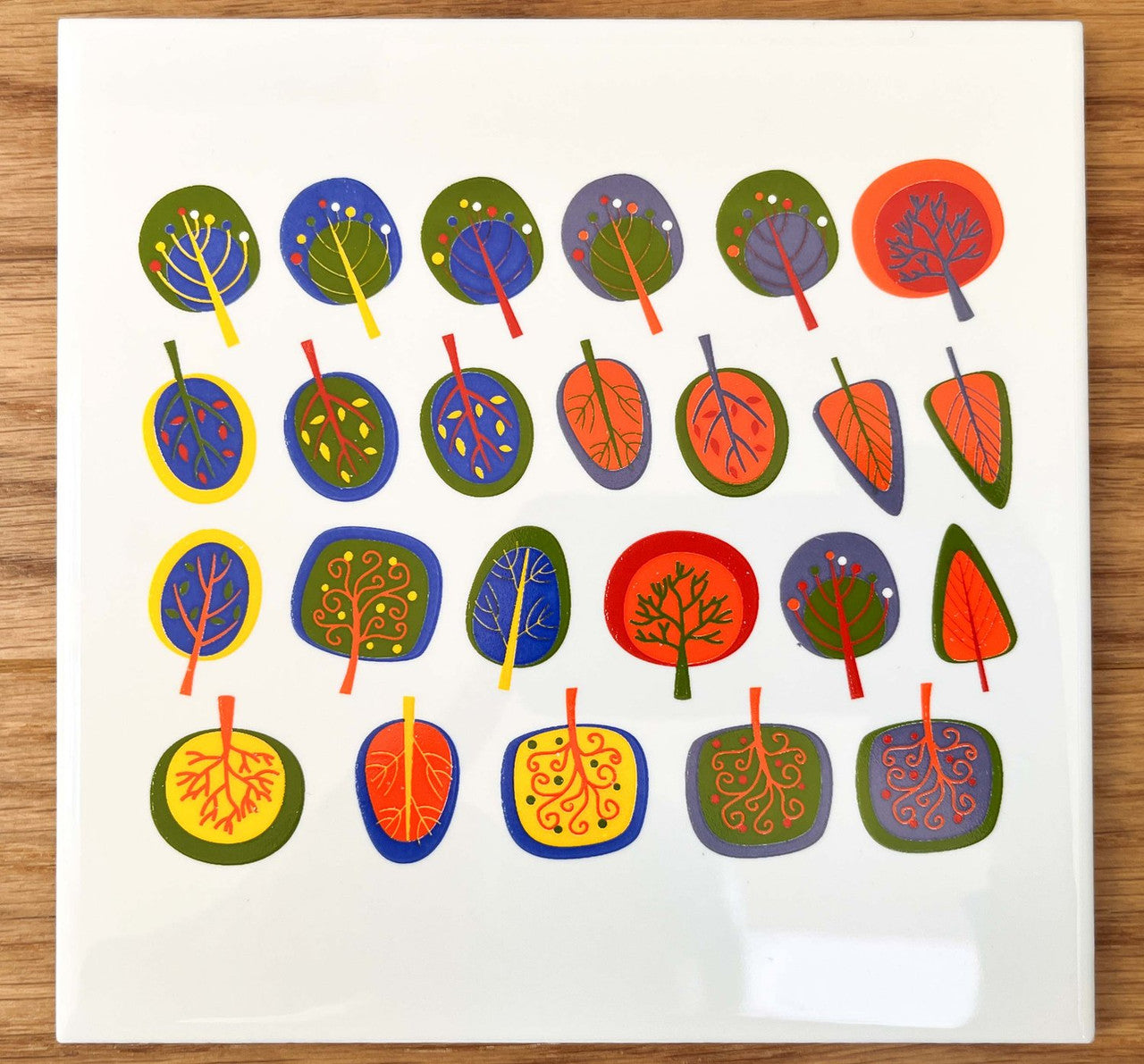 Individual, multicolored, cartoon trees. Colors included are green, blue, red, yellow, and orange.