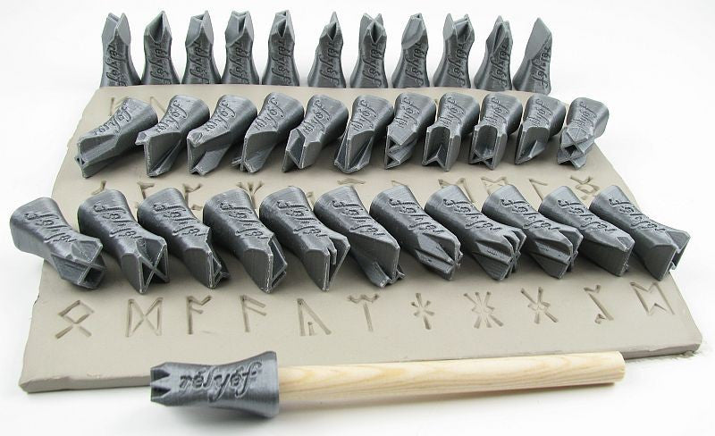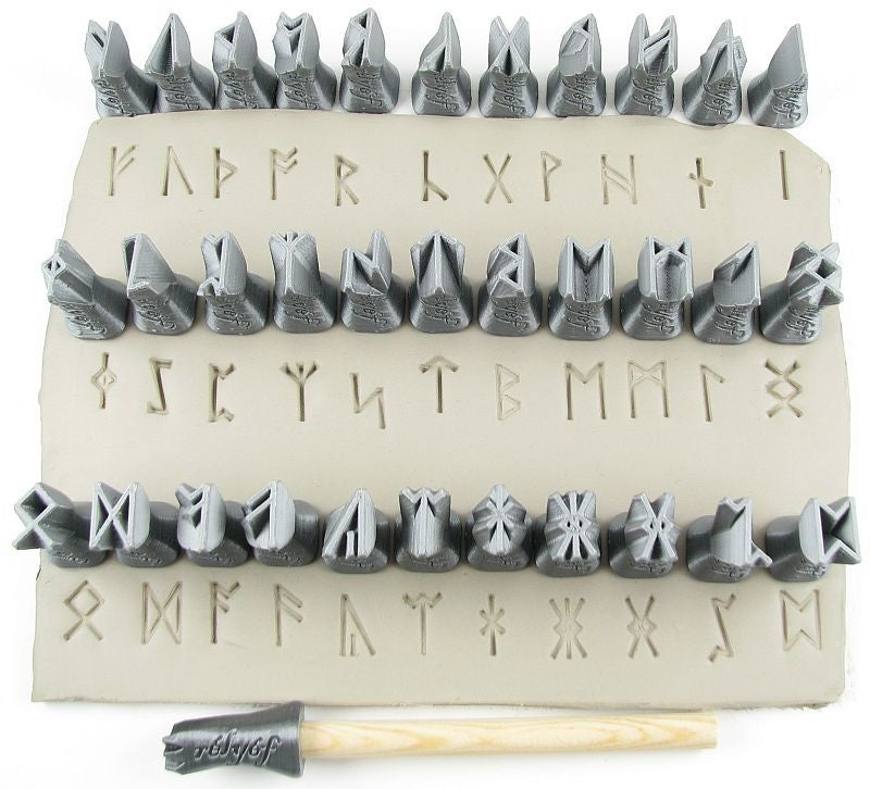 Set contains 34 stamps of Runes height 1/2" (13 mm), a wooden rod (8 mm in diameter) and instructions.