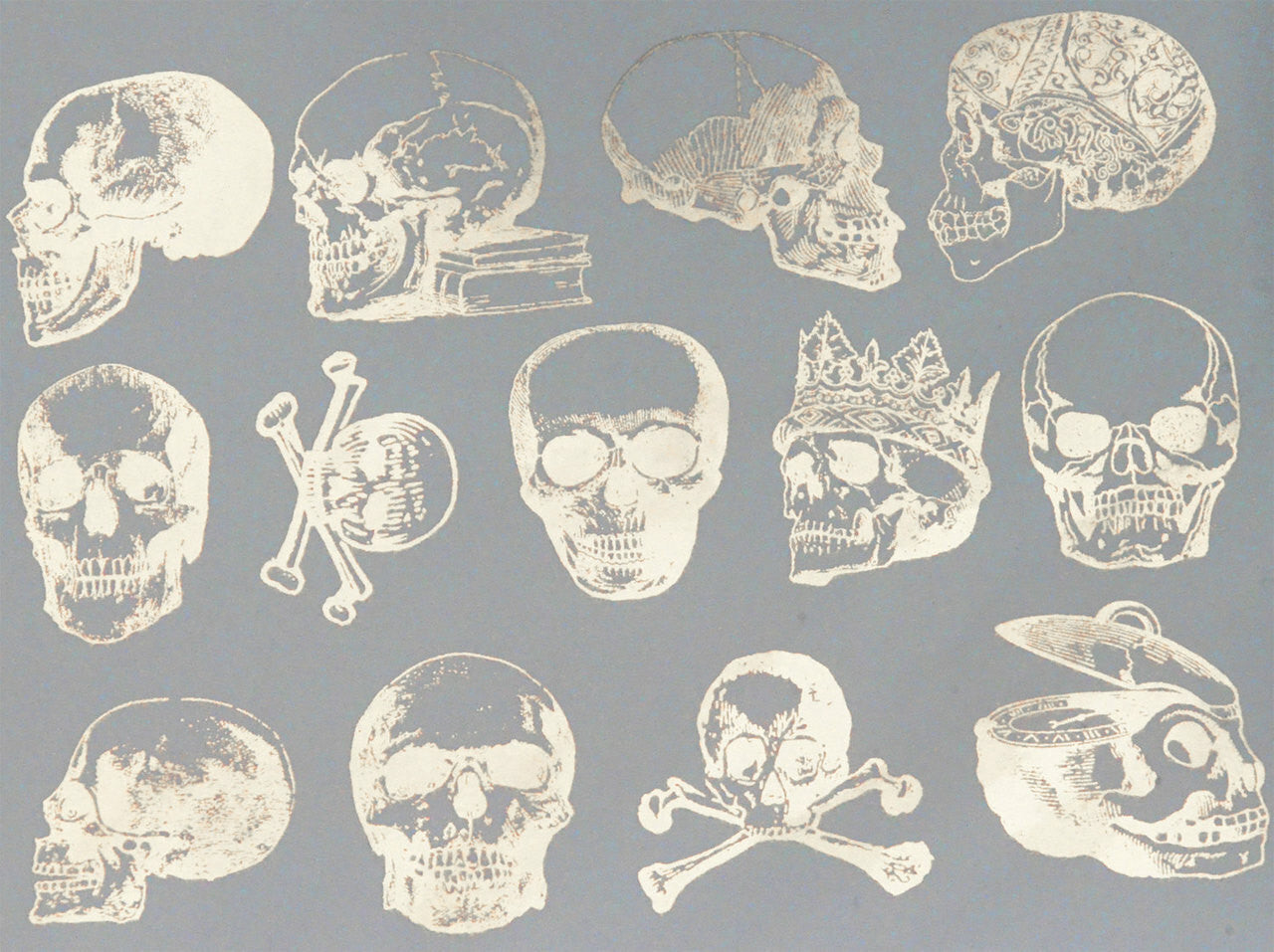 Individual skulls in different positions and some posed with objects like crowns. Available in gold, white, and silver.