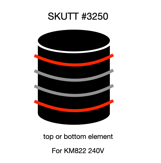 Skutt Elements for the KM/KMT 822 and 822-3 models of kiln. Please select your brick thickness, electrical specs, and which element position you need. If you are looking for a specific part number, please review the complete guide we posted under the images in the section titled "Skutt elements"