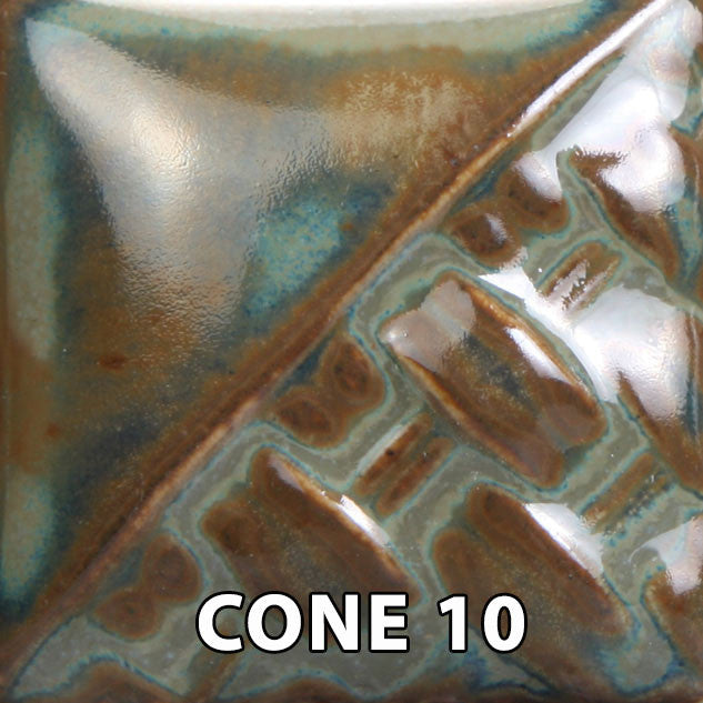 Cone 6: Smoke is an opaque grey-blue stoneware glaze with soft, subtle variegating hues. Application thickness strongly influences the fired color; surface texture will also produce variegation during the firing. Cone 10: Color changes to a variegated sage green with a glossy finish. TIP: One coat creates a blue-grey haze over a weathered brown; Two coats intensify the grey cast while Three coats intensify the overall grey-blue opaque finish. Brown breaks on raised surfaces on the body.