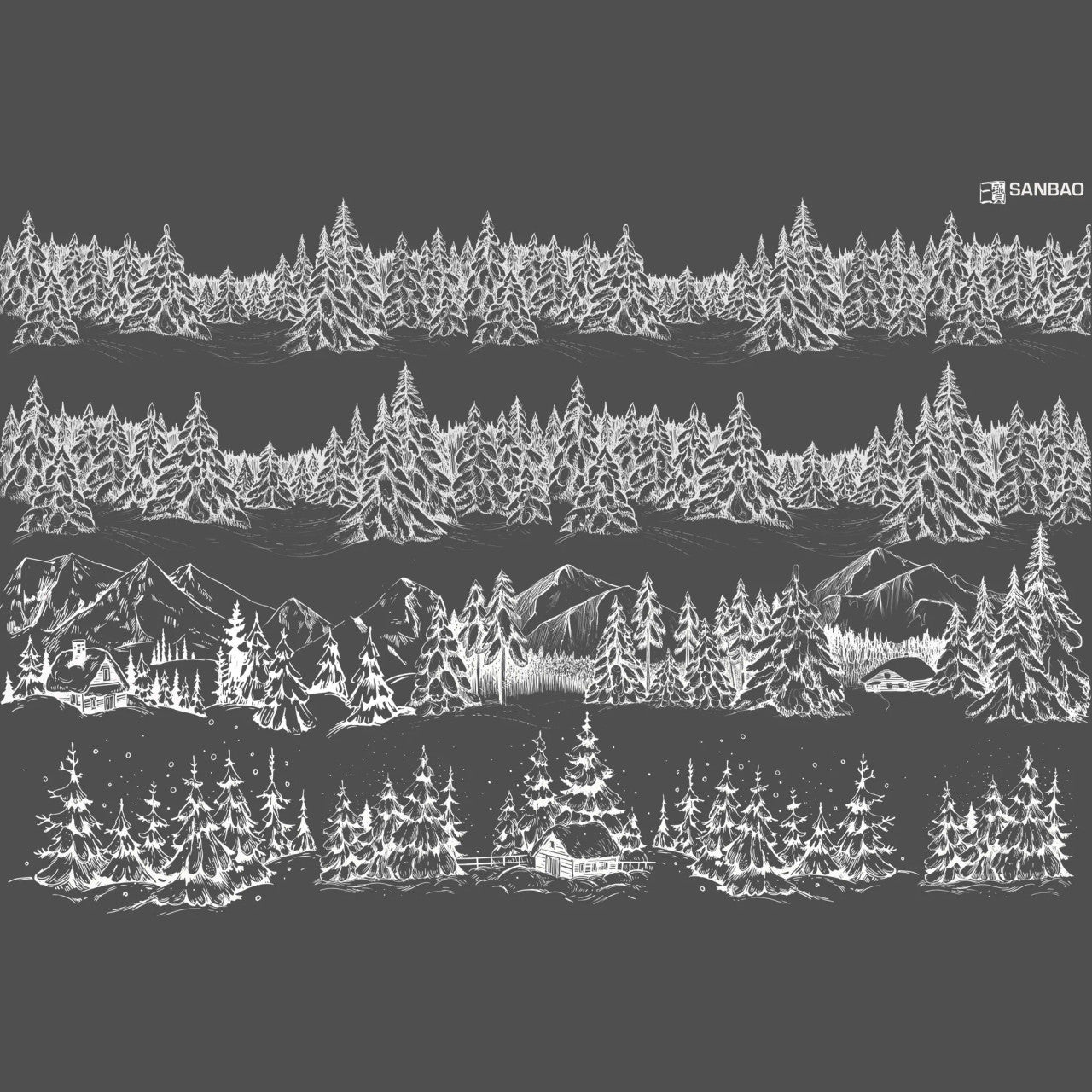 Bands of snowy landscapes including pine trees, mountains, and a log cabin. Available in black, white, and blue.