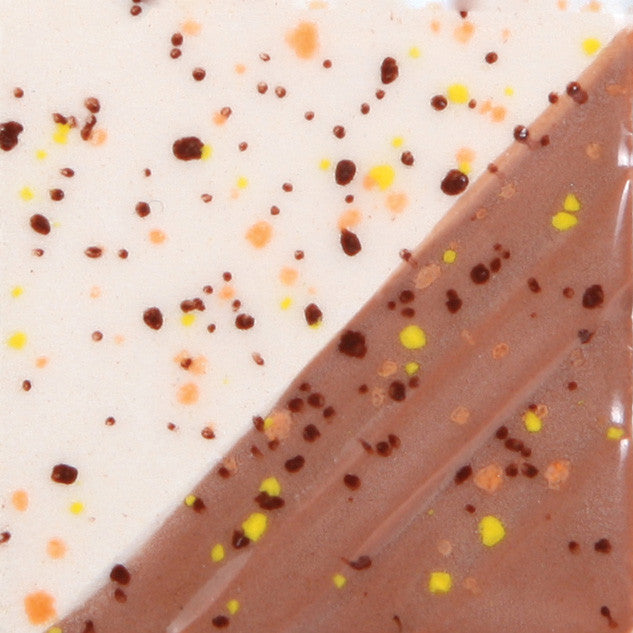 Autumn: Cone 06: A transparent clear glaze with colorful orange, yellow and brown specks that will change the look with different base glazes. Cone 6: Color Specks fade and begin to flow. TIP: Chips shown over SC-41 Brown Cow and unglazed bisque.