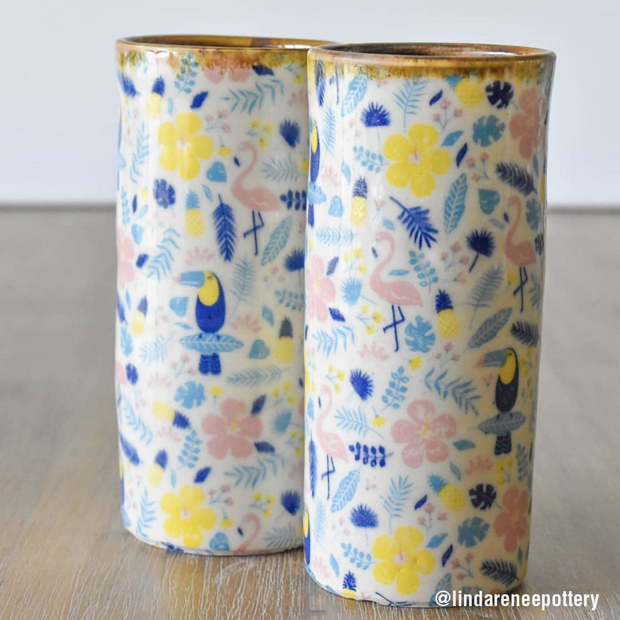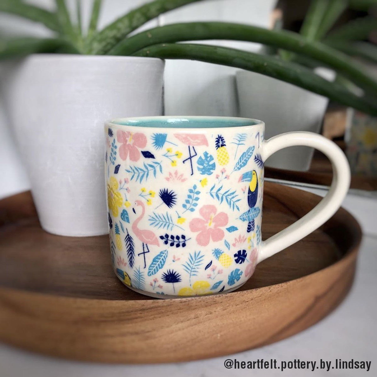 A multicolored pattern including flowers, leaves, flamingoes, and toucans. Colors featured include pink, blue, and yellow.