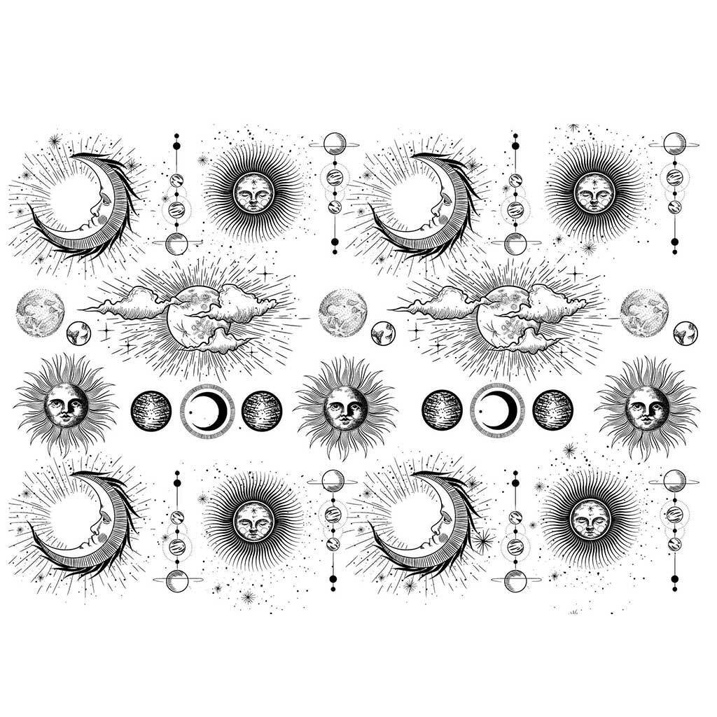 Individual images of the sun and moon in stylized designed, including clouds and faces. Available in black.