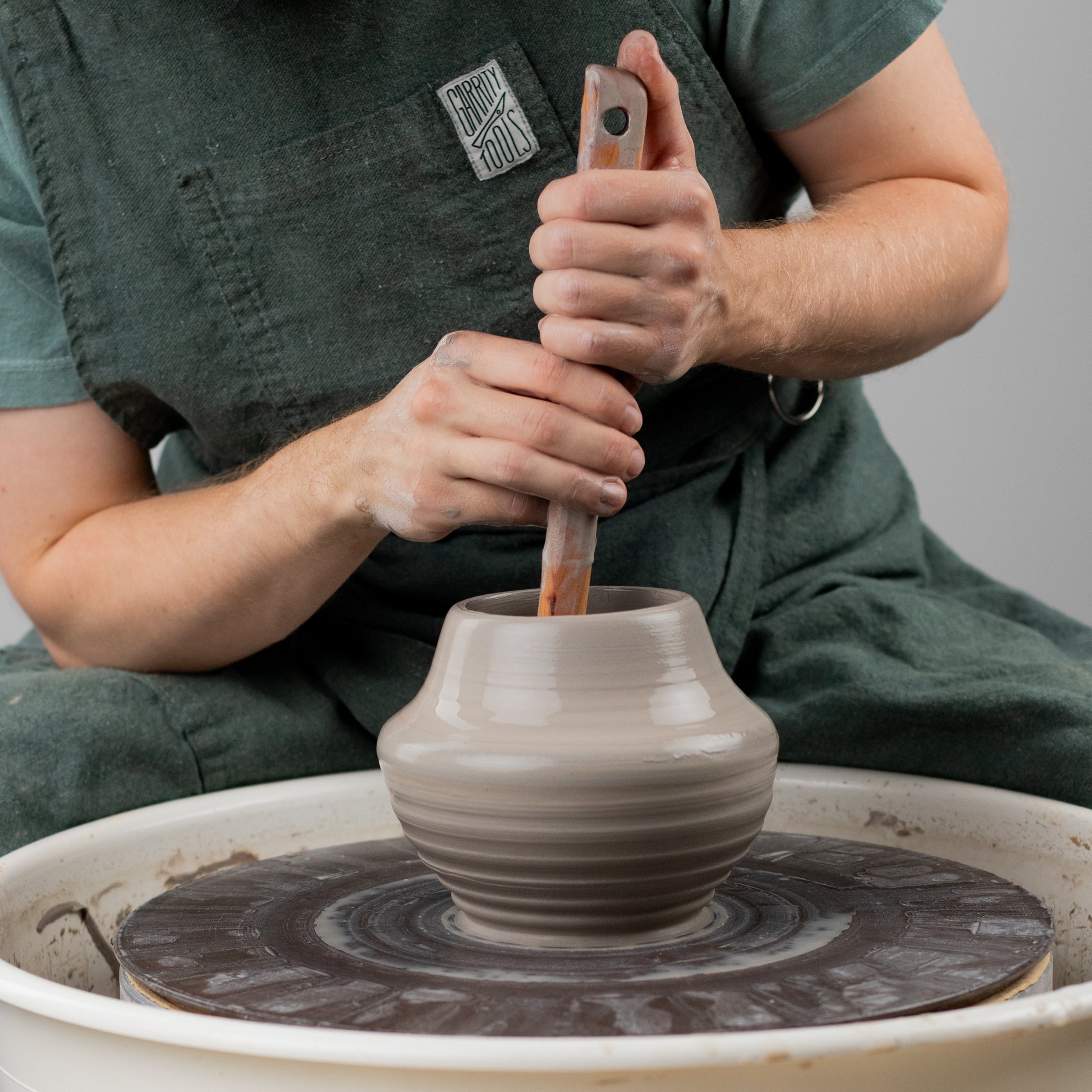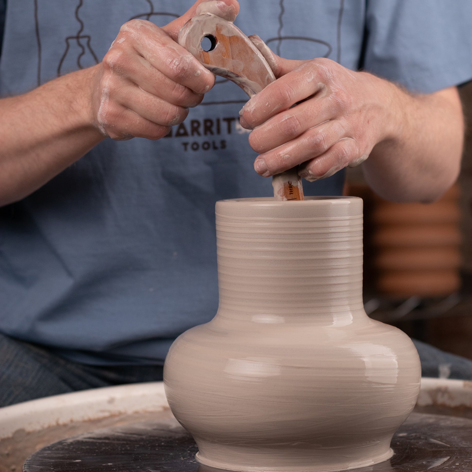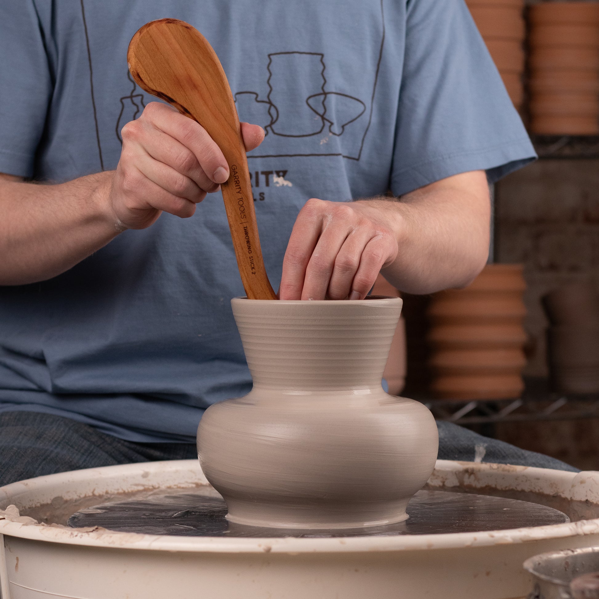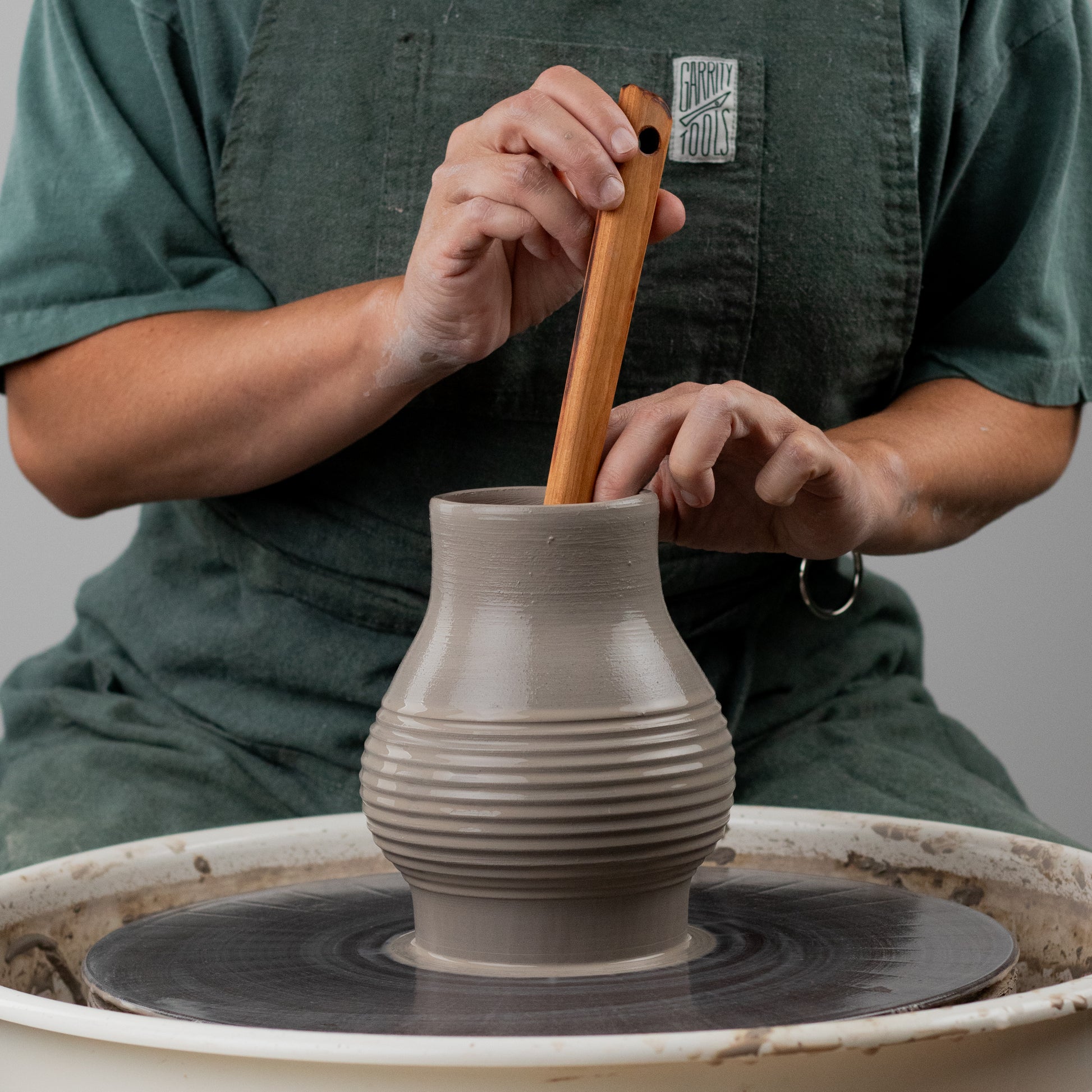 Garrity Tools Throwing Sticks are designed for easy gripping while you use it to expand and shape narrow-mouthed vessels. Drop into a tall thin cylinder and gently press the head of the Throwing Stick against the lower walls to create round forms. With this tool, you can change the form of your vessel from the inside while retaining exterior textures and details. The shape of the head was tested and perfected for stretching clay in many directions and will assist you in pulling your walls straight up or pushing them out wide.