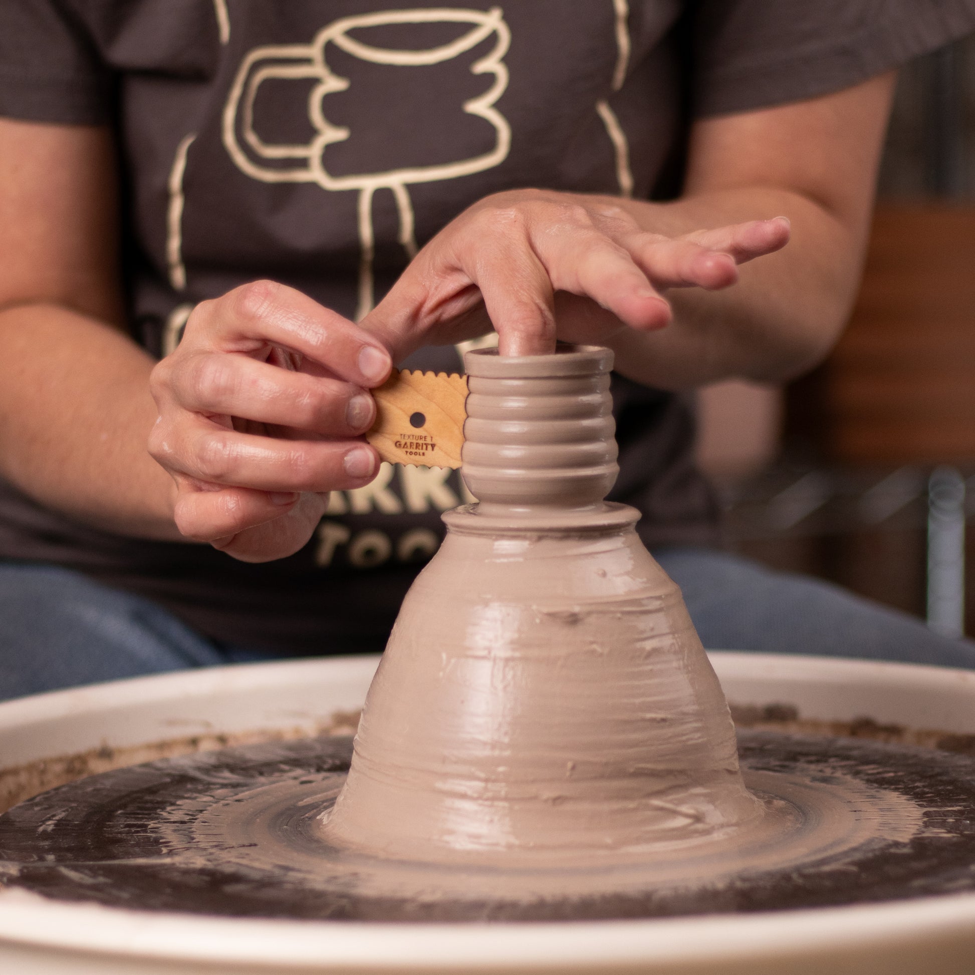 mini tool set 1 includes a small Texture 1, Unfoot 2, T6, and T1. They come sealed up in an adorable (and recyclable) bag! You can use these tools on a small wheel or when you’re throwing off the hump to make tiny vessels. They come in handy for centering, adding texture, refining form, and straightening up sides.
