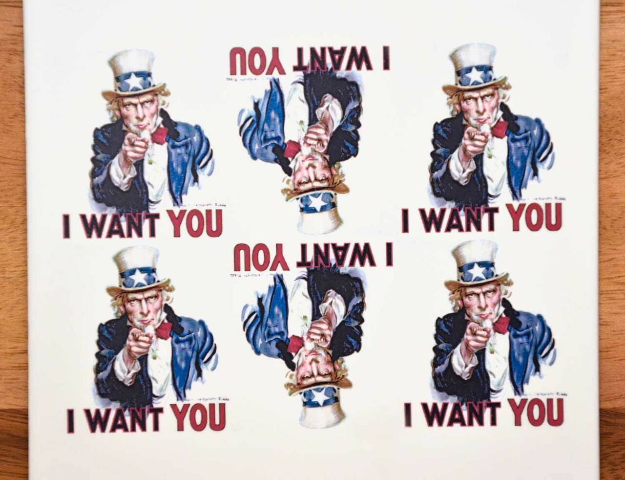 Individual, multicolored images of the classic Uncle Sam army poster with the phrase "I want you". Colors included are blue, white, and red.