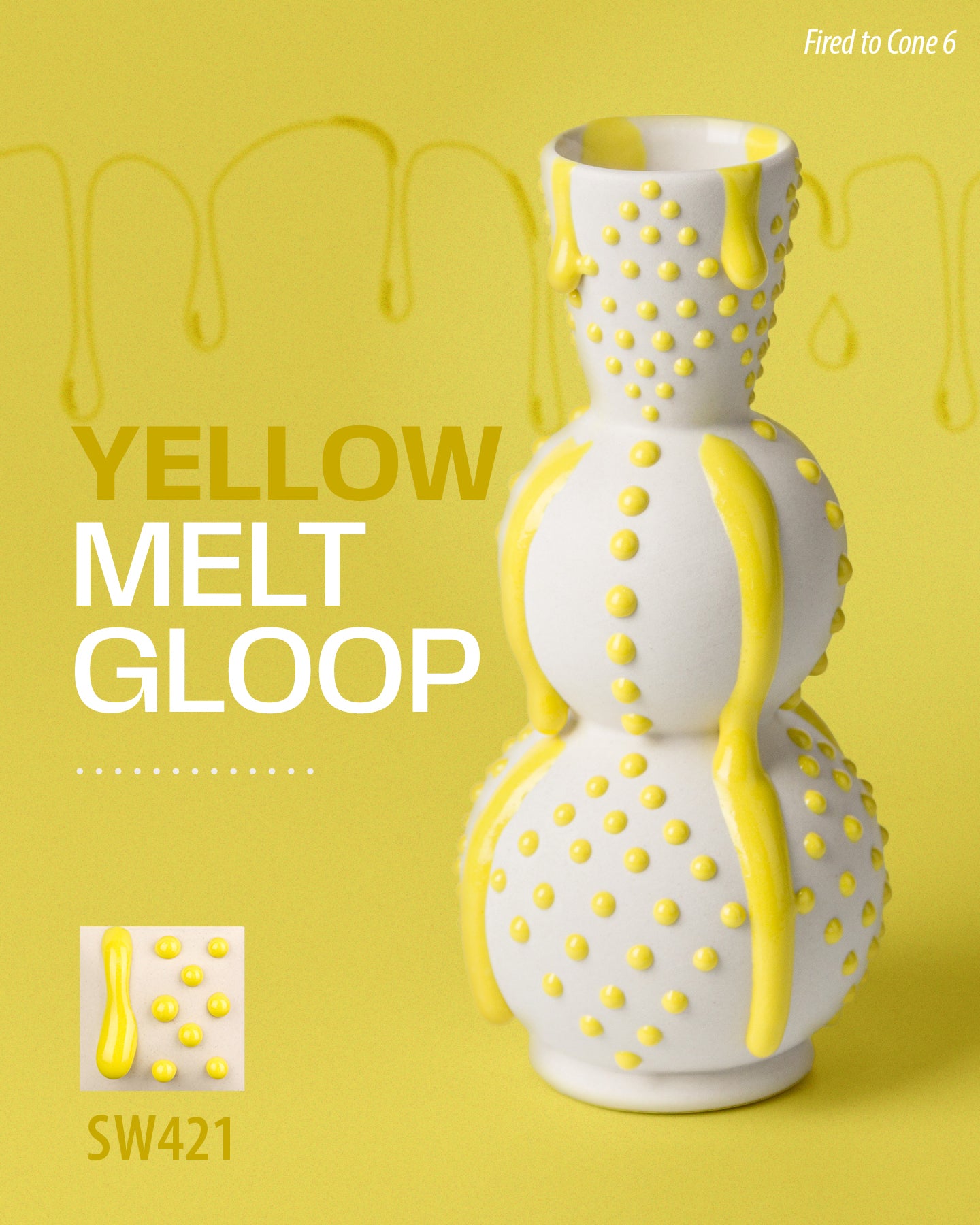 Melt Gloop is a stoneware glaze designed for application in dots or creating a dripping effect down your ceramic piece. Effects are achieved by applying glaze with a syringe or squeeze bottle on greenware or soft fired, cone 04 stoneware bisque (1940°F/1060°C). Apply dots in varying thickness and patterns. For more movement and a dripping effect, apply larger dots on a vertical surface. Fire to preferred temperature; cone 5-10 (2167°F-2345°F/ 1186°C-1285°C). Sample tile was fired to cone 6 oxidation (1222°C/2232°F). Cone 10 reduction: Increased movement and texture. Testing is recommended. Results may vary.